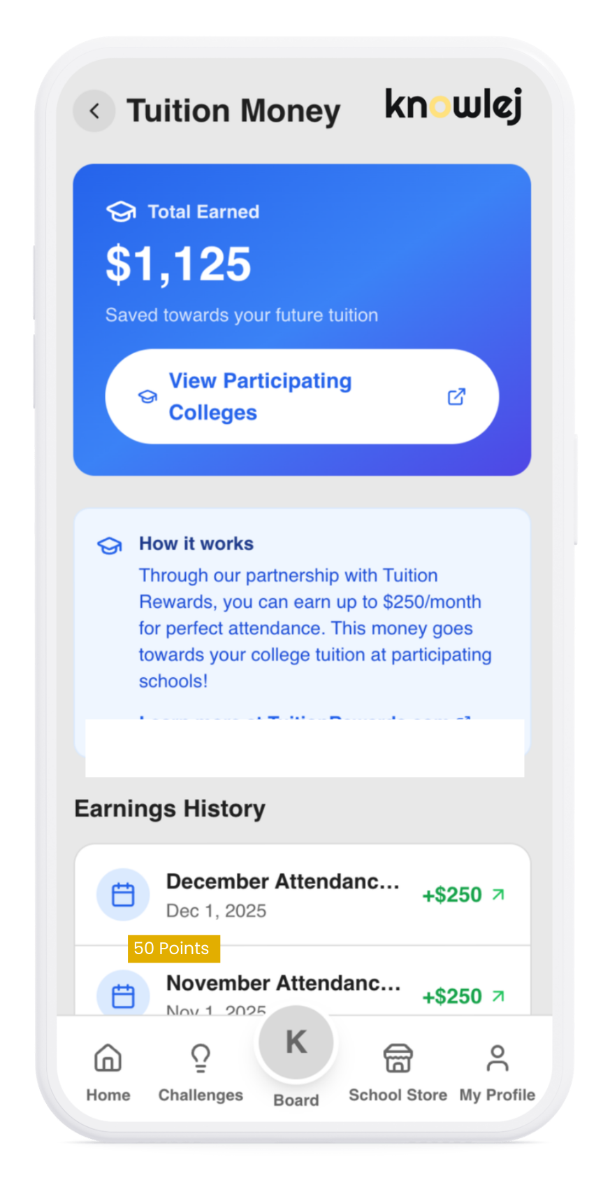 Students earn Knowlej Credits by meeting challenge goals. They can log into their account, view available rewards, and redeem credits for real items and college tution reimbursements from the Knowlej marketplace.
